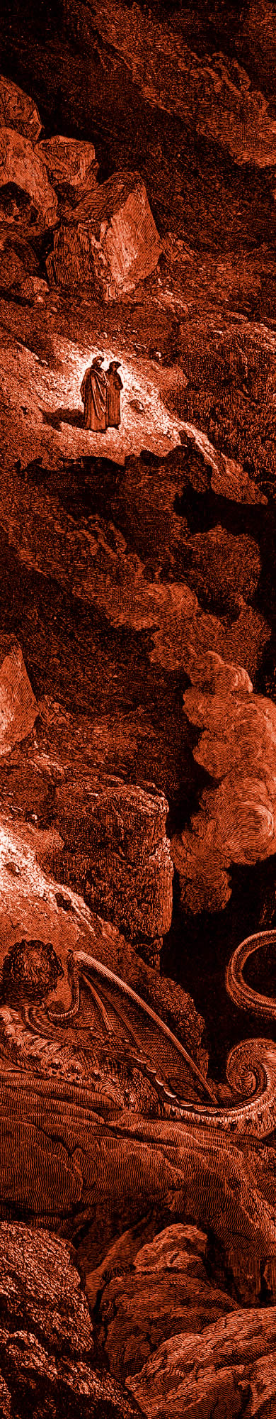 Già era in loco onde s'udìa 'l rimbombo de l'acqua che cadea ne l'altro giro, simile a quel che l'arnie fanno rombo, quando tre ombre insieme si partiro, correndo, d'una torma che passava sotto la pioggia de l'aspro martiro. Venian ver noi, e ciascuna gridava: «Sòstati tu ch'a l'abito ne sembri esser alcun di nostra terra prava». Ahimè, che piaghe vidi ne' lor membri ricenti e vecchie, da le fiamme incese! Ancor men duol pur ch'i' me ne rimembri. A le lor grida il mio dottor s'attese; volse 'l viso ver me, e: «Or aspetta», disse «a costor si vuole esser cortese. E se non fosse il foco che saetta la natura del loco, i' dicerei che meglio stesse a te che a lor la fretta». Ricominciar, come noi restammo, ei l'antico verso; e quando a noi fuor giunti, fenno una rota di sé tutti e trei. Qual sogliono i campion far nudi e unti, avvisando lor presa e lor vantaggio, prima che sien tra lor battuti e punti, così rotando, ciascuno il visaggio drizzava a me, sì che 'n contraro il collo faceva ai piè continuo viaggio. E «Se miseria d'esto loco sollo rende in dispetto noi e nostri prieghi», cominciò l'uno «e 'l tinto aspetto e brollo, la fama nostra il tuo animo pieghi a dirne chi tu se', che i vivi piedi così sicuro per lo 'nferno freghi. Questi, l'orme di cui pestar mi vedi, tutto che nudo e dipelato vada, fu di grado maggior che tu non credi: nepote fu de la buona Gualdrada; Guido Guerra ebbe nome, e in sua vita fece col senno assai e con la spada. L'altro, ch'appresso me la rena trita, è Tegghiaio Aldobrandi, la cui voce nel mondo sù dovrìa esser gradita. E io, che posto son con loro in croce, Iacopo Rusticucci fui; e certo la fiera moglie più ch'altro mi nuoce». S'i' fossi stato dal foco coperto, gittato mi sarei tra lor di sotto, e credo che 'l dottor l'avrìa sofferto; ma perch'io mi sarei brusciato e cotto, vinse paura la mia buona voglia che di loro abbracciar mi facea ghiotto. Poi cominciai: «Non dispetto, ma doglia la vostra condizion dentro mi fisse, tanta che tardi tutta si dispoglia, tosto che questo mio segnor mi disse parole per le quali i' mi pensai che qual voi siete, tal gente venisse. Di vostra terra sono, e sempre mai l'ovra di voi e li onorati nomi con affezion ritrassi e ascoltai. Lascio lo fele e vo per dolci pomi promessi a me per lo verace duca; ma 'nfino al centro pria convien ch'i' tomi». «Se lungamente l'anima conduca le membra tue», rispuose quelli ancora, «e se la fama tua dopo te luca, cortesia e valor dì se dimora ne la nostra città sì come suole, o se del tutto se n'è gita fora; ché Guiglielmo Borsiere, il qual si duole con noi per poco e va là coi compagni, assai ne cruccia con le sue parole». «La gente nuova e i sùbiti guadagni orgoglio e dismisura han generata, Fiorenza, in te, sì che tu già ten piagni». Così gridai con la faccia levata; e i tre, che ciò inteser per risposta, guardar l'un l'altro com'al ver si guata. «Se l'altre volte sì poco ti costa», rispuoser tutti «il satisfare altrui, felice te se sì parli a tua posta! Però, se campi d'esti luoghi bui e torni a riveder le belle stelle, quando ti gioverà dicere I' fui, fa che di noi a la gente favelle». Indi rupper la rota, e a fuggirsi ali sembiar le gambe loro isnelle. Un amen non saria potuto dirsi tosto così com'e' fuoro spariti; per ch'al maestro parve di partirsi. Io lo seguiva, e poco eravam iti, che 'l suon de l'acqua n'era sì vicino, che per parlar saremmo a pena uditi. Come quel fiume c'ha proprio cammino prima dal Monte Viso 'nver' levante, da la sinistra costa d'Apennino, che si chiama Acquacheta suso, avante che si divalli giù nel basso letto, e a Forlì di quel nome è vacante, rimbomba là sovra San Benedetto de l'Alpe per cadere ad una scesa ove dovea per mille esser recetto; così, giù d'una ripa discoscesa, trovammo risonar quell'acqua tinta, sì che 'n poc'ora avria l'orecchia offesa. Io avea una corda intorno cinta, e con essa pensai alcuna volta prender la lonza a la pelle dipinta. Poscia ch'io l'ebbi tutta da me sciolta, sì come 'l duca m'avea comandato, porsila a lui aggroppata e ravvolta. Ond'ei si volse inver' lo destro lato, e alquanto di lunge da la sponda la gittò giuso in quell'alto burrato. 'E' pur convien che novità risponda' dicea fra me medesmo 'al novo cenno che 'l maestro con l'occhio sì seconda'. Ahi quanto cauti li uomini esser dienno presso a color che non veggion pur l'ovra, ma per entro i pensier miran col senno! El disse a me: «Tosto verrà di sovra ciò ch'io attendo e che il tuo pensier sogna: tosto convien ch'al tuo viso si scovra». Sempre a quel ver c'ha faccia di menzogna de' l'uom chiuder le labbra fin ch'el puote, però che sanza colpa fa vergogna; ma qui tacer nol posso; e per le note di questa comedìa, lettor, ti giuro, s'elle non sien di lunga grazia vòte, ch'i' vidi per quell'aere grosso e scuro venir notando una figura in suso, maravigliosa ad ogne cor sicuro, sì come torna colui che va giuso talora a solver l'àncora ch'aggrappa o scoglio o altro che nel mare è chiuso, che 'n sù si stende, e da piè si rattrappa. 1 4 7 10 13 16 19 22 25 28 31 34 37 40 43 46 49 52 55 58 61 64 67 70 73 76 79 82 85 88 91 94 97 100 103 106 109 112 115 118 121 124 127 130 133 136 Now was I where was heard the reverberation Of water falling into the next round, Like to that humming which the beehives make, When shadows three together started forth, Running, from out a company that passed Beneath the rain of the sharp martyrdom. Towards us came they, and each one cried out: “Stop, thou; for by thy garb to us thou seemest To be some one of our depraved city”. Ah me! what wounds I saw upon their limbs, Recent and ancient by the flames burnt in! It pains me still but to remember it. Unto their cries my Teacher paused attentive; He turned his face towards me, and “Now wait”, He said; “to these we should be courteous. And if it were not for the fire that darts The nature of this region, I should say That haste 